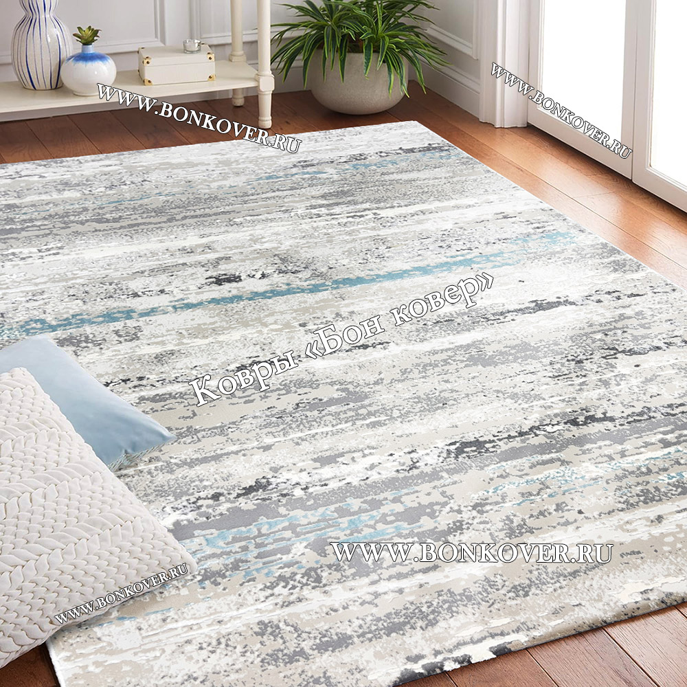 Элегантный Ковер Турция Современный Дизайн 25 Серый с Голубым наполняет интерьер гостиной теплом и уютом, гармонично сочетает в себе изящество и красоту. Он соткан из высококачественного сырья, прочный и долговечный.