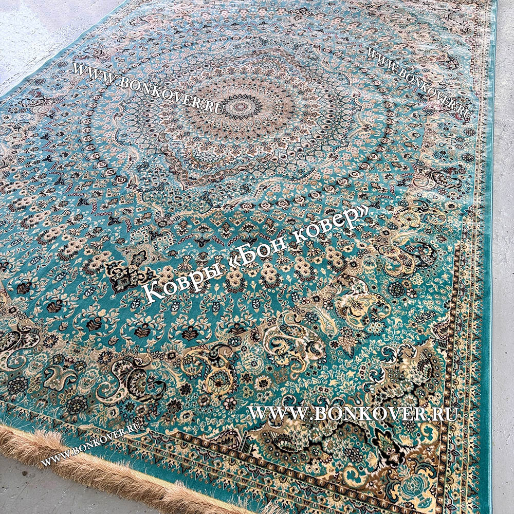Красивый Восточный Ковер Для Гостиной Медальон Дизайн 28767 Бирюзовый наполняет интерьер помещения теплом и уютом, гармонично сочетает в себе изящество и стиль. Он создан из экологически чистого сырья, прочный и долговечный.